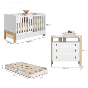 Quarto de Bebê Berço mini cama Cômoda 3 Gavetas Fantasia Qmovi e Colchão Gazin Quarto de Bebê com Berço Mini Cama, Cômoda 3 Gavetas Fantasia Qmovi e Colchão Gazin O conjunto Fantasia da Qmovi foi desenvolvido para oferecer conforto, segurança e um toque criativo ao quarto do bebê. Com design moderno e pés em estilo madeira, o berço transmite charme e aconchego ao ambiente. Certificado pelo Inmetro, proporciona noites mais seguras e tranquilas. Além disso, sua função 2 em 1 permite a conversão para mini cama, acompanhando o crescimento da criança. A cômoda com 3 gavetas oferece praticidade no dia a dia, com espaço ideal para organizar roupas e itens do bebê. Para completar, o colchão infantil Supreme Gazin oferece conforto e higiene, com revestimento em tecido plano que ajuda a evitar o acúmulo de poeira e facilita a limpeza.