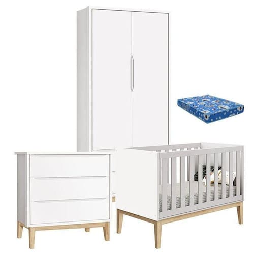 Quarto de Bebê Classic 2 Portas com Colchão e Cômoda Gaveteiro Branco Pés Madeira Natural ? Reller