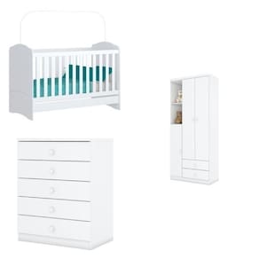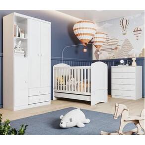 Quarto de Bebê com 1 Guarda Roupa 1 Cômoda e Berço 3 em 1 Abracadabra Espresso Móveis Branco. Esse lindo Quarto de bebê Completo é tudo o que você pediu em um único ambiente. Toda essa combinação foi pensada para que este conjunto permaneça em sua casa por muitos anos acompanhando o crescimento de seus pequenos. O Berço Mini Cama traz todo o conforto e a segurança que seu bebê precisa para dormir tranquilo. Produzido em MDP, a sustentação possui revestimento interno e externo com pintura UV, esse revestimento assegura durabilidade ao móvel. Além de suas funcionalidades como, estrado com regulagem de altura, mosquiteiro, o berço se transforma em Sofá-cama e Mini-cama. O Roupeiro possui 3 portas e 2 Gavetas externas com corrediças metálicas e a cômoda possui 05 gavetas com corrediças metálicas, que permite um deslize mais seguro e suave.