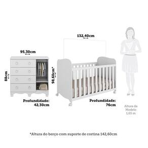 Berço: 98,60 x 132,40 x 76 (AxLxP - cm) Acompanha Colchão: Não Altura do Conjunto: 98,6 cm Ambiente Principal: Quarto de Bebê codigo_ean: 7900288218926 Cor: Branco Brilho Cor do Produto: Branco Brilho Estrado com Regulagem de Altura: Sim Informação Complementar: 1x Cômoda Infantil 1 Porta 4 Gavetas 100% MDF Mimo Branco Brilho Necessita Montagem: Sim