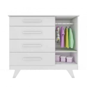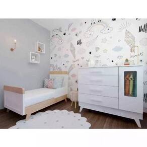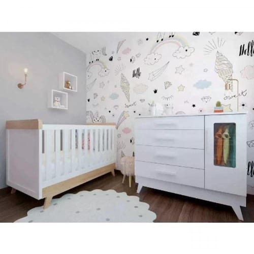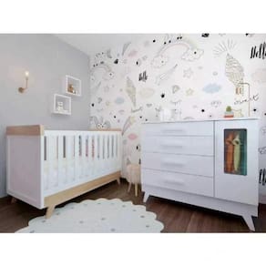 Quarto de Bebê com Berço Cômoda com Janela e 2 Nichos 100% MDF Retrô Kakau Espresso Móveis Branco Brilho/Carvalho. Inspirado no estilo retrô do passado com um toque de modernidade a linha Kakau é encantadora. O berço é certificado pelo INMETRO no registro 000781/2018, tem a opção de ser utilizado como mini cama, acompanha um suporte para mosquiteiro e a base do colchão é regulável em 3 opções de altura, aumentando o conforto no uso diário e na segurança com o crescimento do seu pequeno(a). São móveis com acabamento em pintura UV atóxica e com a qualidade de ser produzido em 100% MDF. As gavetas possuem corrediças telescópicas e suportam até 4kg cada. Tudo para oferecer um quartinho aconchegante, pratico e lindo para o seu bebê. Medidas dos produtos (cm): Berço: 92,20 x 135,50 x 76,30 (AxLxP) Cômoda: 104,80 x 118,60 x 50 (AxLxP) Nicho (cada): 30 x 30 x 12,50 (AxLxP) Ean: 7908388151600