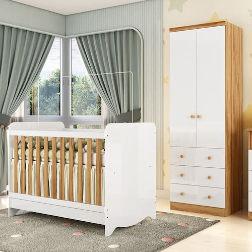 Quarto de Beb? Completo com Ber?o Minicama Ben e Guarda Roupa C?moda Smim New MDF M?veis Peroba. Os produtos foram desenvolvidos para oferecer qualidade, beleza, conforto e seguran?a para toda fam?lia na hora de montar o quarto do beb?.O Guarda Roupas Smim ? confeccionado em MDF e tem acabamento em pintura UV at?xica. Portas de bater tem dobradi?as met?licas e gavetas possuem corredi?as met?licas telesc?picas com deslize suave e silencioso, com puxadores pontuais em pl?stico. Acompanha dois modelos de rodap?s que podem ser escolhidos na hora de montar. Uma ?tima solu??o para espa?os reduzidos. ? um produto funcional e indispens?vel.
