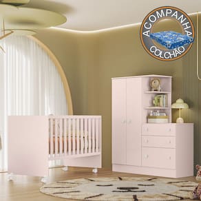 Características: Estrutura em MDP Acabamento em pintura UV Atóxica Grades de Proteção Acompanha suporte mosquiteiro Berço simples Suporta até 40 kg Acompanha Kit de rodízios Acompanha colchão de 130x60 cm 02 Portas e 03 Gavetas Cabideiro oblongo metálico Gavetas com corrediças metálicas Puxadores duplos Portas com dobradiças metálicas Prateleiras com amplo espaço.