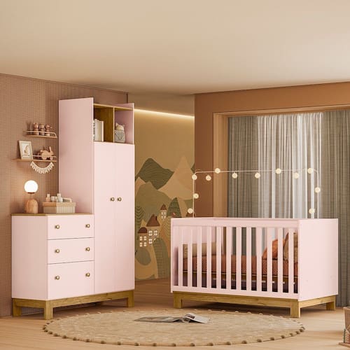 Características: Estrutura em MDP Acabamento em Pintura UV 03 Gavetas com corrediças metálicas 02 Portas com dobradiças metálicas 01 Cabideiro metálico 04 Prateleiras Puxadores em Poliuretano (PU) Pés em MDF 25mm Sistema anti-tombamento Estrutura produzida com materiais de alta qualidade Berço padrão Americano Estrado em MDF 6mm regulável em três alturas Pode ser transformado em mini cama Acompanha suporte para mosquiteiro Pintura atóxica e livre de materiais pesados Peso suportado no berço: 40 kg distribuidos e sem impacto Peso suportado nas prateleiras: 3, 7 e 10 kg distribuidos e sem impacto Peso suportado nas gavetas: 5 kg distribuidos e sem impacto Peso suportado no tampo: 7 kg distribuidos e sem impacto Peso suportado no cabideiro: 15 kg distribuidos e sem impacto Ideal para colchões de 70x130 *NÃO ACOMPANHA COLCHÃO*