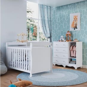 Quarto de Bebê com Cômoda 1 Porta e Berço Americano Nina Espresso Móveis Branco Brilho. Qualidade, beleza, conforto e segurança para toda família na hora de montar o quartinho do(a) bebê. Essa é a proposta desenvolvida queridinha do momento. Produtos estrurados em 100% MDF e com acabamento em pintura UV atóxica. O berço possui padrão de colchão americano, estrado com altura regulável e todas as bordas arredondadas e laqueadas, que proporcionam mais segurança e uma sensação agradável ao toque, além de pode ser utilizado como mini cama ou mini sofá, prolongando seu uso. Já a cômoda possui gavetas que deslizam suavemente por corrediças telescópicas, facilitando a abertura, cabideiro metálico e prateleira que é ideal para acomodar as peças com organização da sua preferência. Também acompanha o produto, 2 opções de rodapés, um usinado (torneado) e outro reto, para que você escolha no momento da montagem qual se adequa ao estilo do ambiente. Aproveite para adquirir o seu agora! Ambiente composto por: - 1 Cômoda Infantil 1 Porta 4 Gavetas 100% MDF Mimo 88 x 95,3 x 42,3 (AxLxP - cm) - 1 Berço Mini Cama 3 em 1 Americano 100% MDF Cocada 99 x 148 x 78,40 (AxLxP - cm)