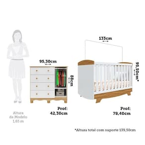 *Altura total com suporte 139,50cm Acompanha Colchão: Não Altura do Conjunto: 95,5 cm Ambiente Principal: Quarto de Bebê codigo_ean: 7900288110633 Cor: Branco Brilho/Amêndoa Cor do Produto: Branco Brilho/Amêndoa Estrado com Regulagem de Altura: Sim Informação Complementar: 1x Cômoda Infantil 1 Porta com Janela e 4 Gavetas 100% MDF Lana Branco Brilho/Amêndoa Necessita Montagem: Sim