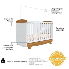 Produtos estrurados em 100% MDF e com acabamento em pintura UV atóxica. O berço possui padrão de colchão americano, estrado com altura regulável e todas as bordas arredondadas e laqueadas, que proporcionam uma sensação agradável ao toque, além de poder ser utilizado como minicama ou minisofá, prolongando seu uso.