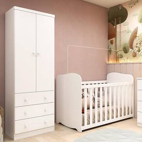Conjunto compacto para quarto infantil composto por Guarda Roupa 2 Portas e Berço. Produzidos em 100% MDF e com acabamento em Pintura UV Átoxica, garantem maior resistência, qualidade e segurança. O guarda roupas possui prateleiras internas com espaço amplo para acomodação das peças e gavetas com corrediças metálicas. O berço possui bordas arredondadas para evitar acidentes e 3 opções de regulagem de altura, permitindo acesso facilitado ao bebê acompanhando suas fases de crescimento. Indicado para uso com colchão de padrão americano (70x130 - LxC).