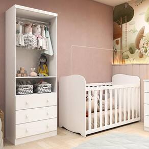 Conjunto para Quarto de Bebê com Guarda Roupa 2 Portas Smim e Berço Uli 100% MDF Móveis Peroba Branco Brilho