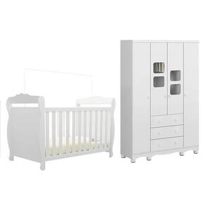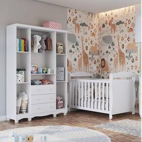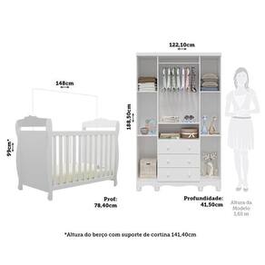 Qualidade, beleza, conforto e segurança para toda família na hora de montar o quartinho do(a) bebê. Essa é a proposta desenvolvida queridinha do momento. Produtos estrurados em 100% MDF e com acabamento em pintura UV atóxica. O berço possui padrão de colchão americano, estrado com altura regulável e todas as bordas arredondadas e laqueadas, que proporcionam mais segurança e uma sensação agradável ao toque, além de poder ser utilizado como mini cama ou mini sofá, prolongando seu uso. Já o guarda roupas possui gavetas que deslizam suavemente por corrediças telescópicas, facilitando a abertura, cabideiro metálico e prateleiras que são ideais para acomodar as peças com organização da sua preferência. Também acompanha o produto, 2 opções de rodapés, um usinado (torneado) e outro reto, para que você escolha no momento da montagem qual se adequa ao estilo do ambiente. Aproveite para adquirir o seu agora! Ambiente composto por: - 1 Guarda Roupa 4 Portas com Janelas e 3 Gavetas 188,50 x 122,10 x 41,80 (A x L x P - cm) - 1 Berço Mini Cama 3 em 1 99 x 148 x 78,40 (A x L x P - cm)
