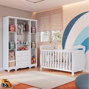 Qualidade, beleza, conforto e segurança para toda família na hora de montar o quartinho do(a) bebê. Essa é a proposta desenvolvida queridinha do momento. Produtos estrurados em 100% MDF e com acabamento em pintura UV atóxica. O berço possui padrão de colchão americano, estrado com altura regulável e todas as bordas arredondadas e laqueadas, que proporcionam mais segurança e uma sensação agradável ao toque, além de pode ser utilizado como mini cama ou mini sofá, prolongando seu uso. Já o guarda roupas possui gavetas que deslizam suavemente por corrediças telescópicas, facilitando a abertura, cabideiro metálico e prateleiras que são ideais para acomodar as peças com organização da sua preferência. Também acompanha o produto, 2 opções de rodapés, um usinado (torneado) e outro reto, para que você escolha no momento da montagem qual se adequa ao estilo do ambiente. Aproveite para adquirir o seu agora!