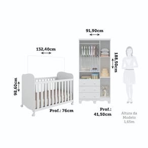 Guarda Roupa: 188,5 x 91,9 x 41,5 (AxLxP - cm) Altura do Conjunto: 188.5 cm Ambiente: null Ambiente Principal: Quarto de Bebê Cor: Branco Brilho Estrado com Regulagem de Altura: Sim Informação Complementar: 1x Berço Americano 100% MDF com rodízios Mimo Branco Brilho Largura: 132,4 Altura: 98.59999999999999 Peso: 29.9 Profundidade: 76 Necessita Montagem: Sim