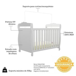 Produtos estrurados em 100% MDF e com acabamento em pintura UV atóxica. O berço possui padrão de colchão americano, estrado com altura regulável e todas as bordas arredondadas e laqueadas, que proporcionam uma sensação agradável ao toque, além de poder ser utilizado como minicama ou minisofá, prolongando seu uso.