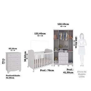 Procurando por móveis que ofereçam conforto e praticidade para a sua família? Esta proposta é perfeita para você! Produzidos em 100% MDF com acabamento em pintura UV atóxica, esse quarto garante a segurança de todos. O guarda-roupas conta com 4 portas e 3 gavetas com corrediças telescópicas, proporcionando facilidade no uso. A cômoda possui 4 gavetas com corrediças telescópicas . Já o berço possui bordas arredondadas, certificado pelo INMETRO, e acompanha varal para mosquiteiro. Aproveite essa oportunidade e adquira já o seu! Medidas do Ambiente (cm): Guarda Roupas: 188,5 x 122,1 x 41,5 (AxLxP - cm) Cômoda: 88 x 65,1 x 42,3 (AxLxP - cm) Berço: 98,6 x 132,4 x 76 (AxLxP)