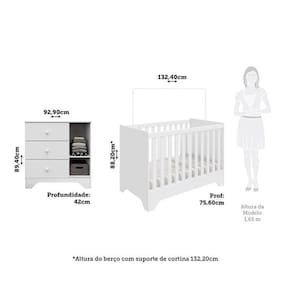 88,20 x 132,4 x 75,60 (A x L x P - cm) Acompanha Colchão: Não Altura do Conjunto: 89.4 cm Ambiente: null Ambiente Principal: Quarto de Bebê Cor: Branco Brilho Estrado com Regulagem de Altura: Sim Informação Complementar: 1x Cômoda Infantil 1 Porta com Janela Retangulo e 3 Gavetas 100% MDF Cocada Branco Brilho Largura: 92,9 cm Altura: 89,4 cm Peso: 34,2 kg Profundidade: 42 cm Necessita Montagem: Sim