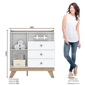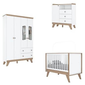 O Guarda-Roupa 4 Portas e 2 gavetas com corrediças telescópicas, cabideiro em alumínio, pintura UV, puxadores em madeira, porta com detalhes em vidro e pés com MDF revestido proporcionam um visual retrô que proporciona ao quarto do seu bebê um ambiente ainda mais lindo. O Berço 3 em 1 é fabricado com materiais de altíssima qualidade, pintura UV e moldura superior com acabamento arredondado, suas grades são fixas com pintura laqueada e bordas suavizadas para evitar acidentes, o lastro possui 2 regulagens de altura. Além disso, O Berço é 3 em 1, podendo ser utilizado como Berço-Cama e Minicama. A Cômoda 3 gavetas e 1 porta e 1 prateleira e 1 nicho, com as corrediças telescópicas, pintura UV e puxadores em madeira com pintura garantem a beleza e sofisticação que o quarto do seu bebê merece. Ambiente Principal: Quarto de Bebê Certificado: INMETRO Nº 002 114/2023 Complexidade da Montagem: Alta: deve ser montado por um montador especializado Cor: Branco/Jequitibá HP Cor do Produto: Branco/Jequitibá HP Escala de Brilho: Fosco Informações Complementares: Guarda Roupa Theo (AxLxP) 200cm X 131cm X 41cm; Berço Theo (AxLxP) 104,5cm X 139cm X 78,5cm; Cômoda Theo (AxLxP) 104cm X 98cm X 43cm; Linha ou Coleção: Theo Manual de Montagem e Instalação: https://cdn2.madeiramadeira.com.br/atributo/henn-infantil-e-bebe-cozinha/1382891-ie85-quarto-de-bebe-completo-retro-theo.pdf Material Principal: MDF/MDP Medida de Cada Item: Guarda Roupa Theo (AxLxP) 200cm X 131cm X 41cm; Berço Theo (AxLxP) 104,5cm X 139cm X 78,5cm; Cômoda Theo (AxLxP) 104cm X 98cm X 43cm; Necessita Montagem: Sim Origem do Produto: Nacional Peso: Guarda Roupa: 66kg; Berço: 34kg; Cômoda: 31kg Pintura Atóxica: Sim Possui Portas: Sim Quantidade de Portas: 04 Recomendações de Uso, Manutenção e Limpeza: Recomendamos para limpeza de seu móvel, use uma flanela seca ou umedecida. Não utilize produtos químicos. Sistema de Montagem: Parafusos, Cavilhas, Minifix e Pregos. Suporta Até (kg): 25 Ean: 7909903343340