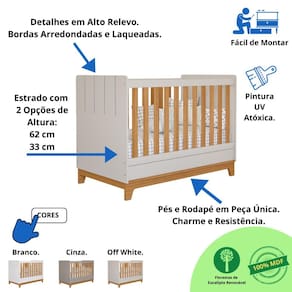 Para criar um quarto do bebê que une sofisticação e segurança, o conjunto Berço e Cômoda Estilo Retrô é a escolha ideal. O Berço Estilo Retrô, feito em 100% MDF com acabamento em pintura laca e detalhes em baixo relevo, não só oferece um ambiente acolhedor desde os primeiros dias, mas também se transforma em uma charmosa mini cama à medida que seu filho cresce. Com estrado ajustável em duas alturas e duas grades fixas, este berço combina elegância e funcionalidade, adaptando-se às necessidades do seu pequeno ao longo do tempo.