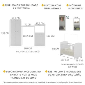 O Quarto Infantil Meu Bebê Multimóveis é produzido em MDP, que garante maior durabilidade e resistência, e possui acabamento acetinado (cerca de 20% de brilho). O berço é padrão nacional (tamanho do colchão 1,30 x 0,60), possui grade fixa, 3 regulagens de altura para o colchão e acompanha suporte para mosquiteiro, que garante noites mais tranquilas de sono para o bebê. Compacta e versátil, esta linha conta módulos individuais e você pode montar da maneira que se adaptar melhor ao seu espaço. Berço certificado pelo INMETRO sob o Selo n 001073/2017. Não acompanha colchão.