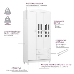 A Cômoda Infantil Carolina Baby Eloá possui 3 gavetas, 1 porta com vitrine em acrílico e 1 prateleira. Conta com fraldário integrado, sistema antitombamento, corrediças telescópicas e dobradiças metálicas, garantindo praticidade e durabilidade no dia a dia.