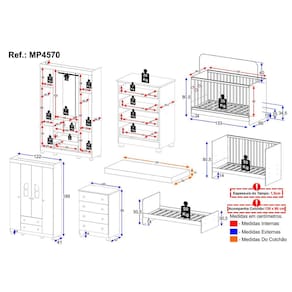 Conteúdo da Embalagem: 1 (um) Berço 1 (um) Colchão 1 (um) Guarda-roupa 1 (uma) Cômoda Manual de Montagem Kit Ferragem