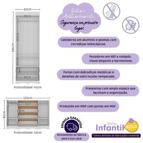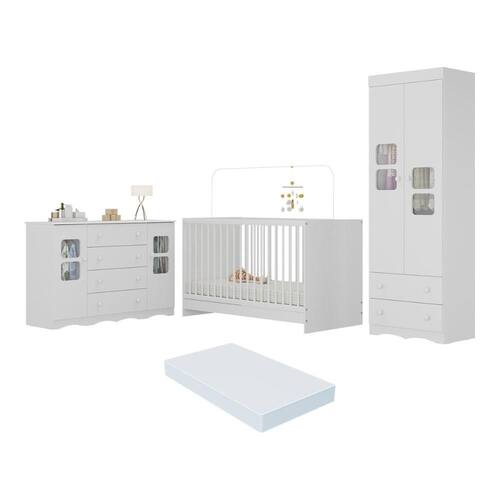 Diferenciais: - Conjunto produzido em MDP/MDF (12/15mm) de reflorestamento com acabamento acetinado (cerca de 20% de brilho): sustentabilidade e durabilidade. - Berço 3 em 1 que se transforma em sofá e minicama, acompanhando o crescimento do bebê. - Lastro em madeira com 3 regulagens de altura e suporte para mosquiteiro para noites mais tranquilas e protegidas. - Berço certificado pelo INMETRO (Selo n 000332/2025). - Colchão D18 incluso: possui tratamento antiácaro, antialérgico, antimofo e um dos lados impermeável. - Frentes e rodapés (guarda-roupa e cômoda) produzidos em MDF. - Guarda-roupa com 2 portas e 2 gavetas: amplo espaço para organizar roupinhas e acessórios. - Cômoda com 2 portas e 4 gavetas. - Detalhes de vidro incolor temperado 3mm nas portas: toque charmoso que permite visualizar o interior dos móveis. - Corrediças telescópicas: abertura total e silenciosa das gavetas. - Cabideiro em alumínio: permite acomodar roupas longas e curtas para que não amassem. - Puxadores em ABS delicados e práticos. - Rodapés usinados: visual elegante para o guarda-roupa e a cômoda. - Sistema antitombamento no guarda-roupa e cômoda: proporciona segurança para o bebê e tranquilidade aos pais.