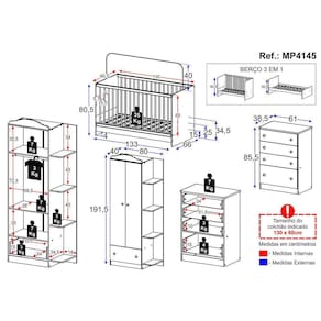 Dimensões do produto montado: Berço - Altura: 80,5cm | Largura: 133cm | Profundidade: 66cm Guarda-Roupa - Altura: 191,5cm | Largura: 80cm | Profundidade: 40cm Cômoda - Altura: 85,5cm | Largura: 61cm | Profundidade: 38,5cm *Você pode consultar as medidas detalhadas na imagem técnica do produto.