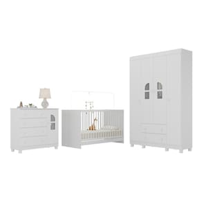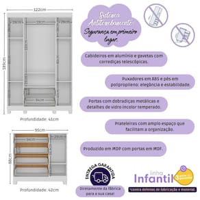 Diferenciais: - 3 anos de garantia contra defeitos de fabricação e material. - Conjunto produzido em madeira de reflorestamento (MDP/MDF 12/15mm) com acabamento acetinado (cerca de 20% de brilho): sustentabilidade e durabilidade. - Berço 3 em 1 que se transforma em sofá e minicama, acompanhando o crescimento do bebê. - Lastro em madeira com 3 regulagens de altura e suporte para mosquiteiro para noites mais tranquilas e protegidas. - Berço certificado pelo INMETRO (Selo n 000332/2025). - Padrão nacional (tamanho do colchão indicado: 130x60cm). Colchão não incluso. - Frentes (guarda-roupa e cômoda) produzidas em MDF. - Guarda-roupa com 4 portas e 2 gavetas: amplo espaço para organizar roupinhas e acessórios. - Cômoda com 1 porta e 4 gavetas. - Detalhes de vidro incolor temperado 3mm nas portas: toque charmoso que permite visualizar o interior dos móveis. - Corrediças telescópicas: abertura total e silenciosa das gavetas. - Cabideiro em alumínio: permite acomodar roupas longas e curtas para que não amassem. - Puxadores em ABS delicados e práticos. - Pés em polipropileno e rodapés: visual elegante e estabilidade para o guarda-roupa e a cômoda. - Sistema antitombamento no guarda-roupa e cômoda: proporciona segurança para o bebê e tranquilidade aos pais.