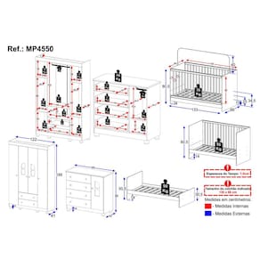 Dimensões do Produto Montado: Berço - Altura: 80,5cm | Largura: 133cm | Profundidade: 66cm Guarda-roupa - Altura: 189cm | Largura: 122cm | Profundidade: 41cm Cômoda - Altura: 88cm | Largura: 95cm | Profundidade: 42cm *Você pode consultar as medidas detalhadas na imagem técnica do produto.