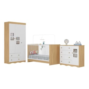 Diferenciais: - Conjunto produzido em MDP/MDF (12/15mm) de reflorestamento com acabamento acetinado (cerca de 20% de brilho): sustentabilidade e durabilidade. - Berço 3 em 1 que se transforma em sofá e minicama, acompanhando o crescimento do bebê. - Lastro em madeira com 3 regulagens de altura e suporte para mosquiteiro para noites mais tranquilas e protegidas. - Berço certificado pelo INMETRO (Selo n 000332/2025). - Padrão nacional (tamanho do colchão indicado: 130x60cm). Colchão não incluso. - Frentes e rodapés (guarda-roupa e cômoda) produzidos em MDF. - Guarda-roupa com 3 portas e 2 gavetas: amplo espaço para organizar roupinhas e acessórios. - Cômoda com 1 porta e 4 gavetas. - Detalhes de vidro incolor temperado 3mm nas portas: toque charmoso que permite visualizar o interior dos móveis. - Corrediças telescópicas: abertura total e silenciosa das gavetas. - Cabideiro em alumínio: permite acomodar roupas longas e curtas para que não amassem. - Puxadores em ABS delicados e práticos. - Rodapés usinados: visual elegante para o guarda-roupa e a cômoda. - Sistema antitombamento no guarda-roupa e cômoda: proporciona segurança para o bebê e tranquilidade aos pais.