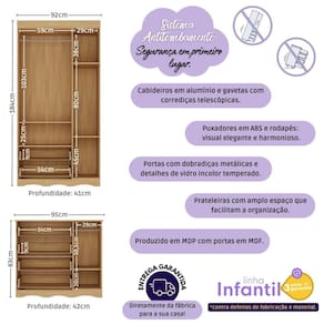 Dimensões do Produto Montado: Berço - Altura: 80,5cm | Largura: 133cm | Profundidade: 66cm Guarda-roupa - Altura: 184cm | Largura: 92cm | Profundidade: 41cm Cômoda - Altura: 83cm | Largura: 95cm | Profundidade: 42cm *Você pode consultar as medidas detalhadas na imagem técnica do produto.