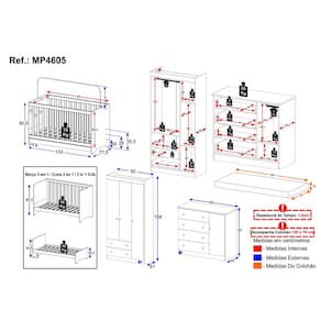 Conteúdo da Embalagem: 1 (um) Berço 1 (um) Colchão 1 (um) Guarda-roupa 1 (uma) Cômoda Manual de Montagem Kit Ferragem