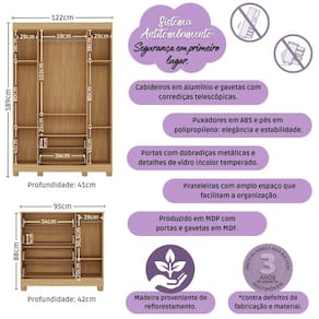 Dimensões do Produto Montado: Berço - Altura: 80,5cm | Largura: 133cm | Profundidade: 77,5cm Guarda-roupa - Altura: 189cm | Largura: 122cm | Profundidade: 41cm Cômoda - Altura: 88cm | Largura: 95cm | Profundidade: 42cm *Você pode consultar as medidas detalhadas na imagem técnica do produto.