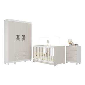 Diferenciais: - 3 anos de garantia contra defeitos de fabricação e material. - Conjunto produzido em madeira de reflorestamento (MDP 12/15mm) com acabamento acetinado (cerca de 20% de brilho): sustentabilidade e durabilidade. - Berço 3 em 1 que se transforma em sofá e minicama, acompanhando o crescimento do bebê. - Lastro em madeira com 3 regulagens de altura e suporte para mosquiteiro para noites mais tranquilas e protegidas. - Berço certificado pelo INMETRO (Selo n 0000085/2018). - Padrão americano (tamanho do colchão indicado: 130x70cm). Colchão não incluso. - Grade Soft (PVC): ecologicamente correta, com matéria-prima livre de metais pesados, atóxica e com proteção antiamarelamento. - Guarda-roupa com 4 portas e 2 gavetas produzidas em MDF: amplo espaço para organizar roupinhas e acessórios. - Cômoda com 4 gavetas. - Detalhes de vidro incolor temperado 3mm nas portas: toque charmoso que permite visualizar o interior dos móveis. - Corrediças telescópicas: abertura total e silenciosa das gavetas. - Cabideiro em alumínio: permite acomodar roupas longas e curtas para que não amassem. - Puxadores em ABS delicados e práticos. - Pés em polipropileno e rodapés: visual elegante e estabilidade para o guarda-roupa e a cômoda. - Sistema antitombamento no guarda-roupa e cômoda: proporciona segurança para o bebê e tranquilidade aos pais.