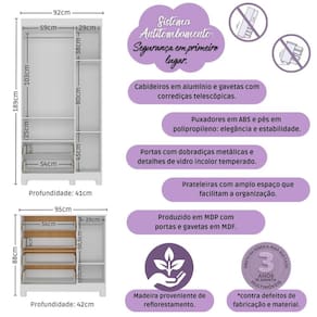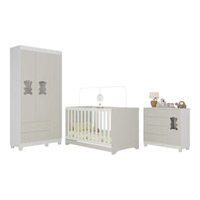 Diferenciais: - 3 anos de garantia contra defeitos de fabricação e material. - Conjunto produzido em madeira de reflorestamento (MDP 12/15mm) com acabamento acetinado (cerca de 20% de brilho): sustentabilidade e durabilidade. - Berço 3 em 1 que se transforma em sofá e minicama, acompanhando o crescimento do bebê. - Lastro em madeira com 3 regulagens de altura e suporte para mosquiteiro para noites mais tranquilas e protegidas. - Berço certificado pelo INMETRO (Selo n 0000085/2018). - Padrão americano (tamanho do colchão indicado: 130x70cm). Colchão não incluso. - Grade Soft (PVC): ecologicamente correta, com matéria-prima livre de metais pesados, atóxica e com proteção antiamarelamento. - Guarda-roupa com 3 portas e 2 gavetas: amplo espaço para organizar roupinhas e acessórios. - Cômoda com 1 porta e 4 gavetas. - Portas e gavetas produzidas em MDF. - Detalhes de vidro incolor temperado 3mm nas portas: toque charmoso que permite visualizar o interior dos móveis. - Corrediças telescópicas: abertura total e silenciosa das gavetas. - Cabideiro em alumínio: permite acomodar roupas longas e curtas para que não amassem. - Puxadores em ABS delicados e práticos. - Pés em polipropileno e rodapés: visual elegante e estabilidade para o guarda-roupa e a cômoda. - Sistema antitombamento no guarda-roupa e cômoda: proporciona segurança para o bebê e tranquilidade aos pais.