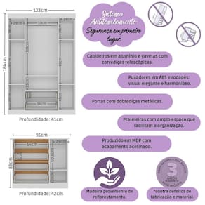 Dimensões do Produto Montado: Berço - Altura: 80,5cm | Largura: 133cm | Profundidade: 77,5cm Guarda-roupa - Altura: 184cm | Largura: 122cm | Profundidade: 41cm Cômoda - Altura: 83cm | Largura: 95cm | Profundidade: 42cm *Você pode consultar as medidas detalhadas na imagem técnica do produto.