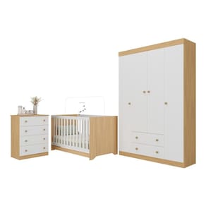 Diferenciais: - 3 anos de garantia contra defeitos de fabricação e material. - Conjunto produzido em madeira de reflorestamento (MDP 12/15mm) com acabamento acetinado (cerca de 20% de brilho): sustentabilidade e durabilidade. - Berço 3 em 1 que se transforma em sofá e minicama, acompanhando o crescimento do bebê. - Lastro em madeira com 3 regulagens de altura e suporte para mosquiteiro para noites mais tranquilas e protegidas. - Berço certificado pelo INMETRO (Selo n 0000085/2018). - Padrão americano (tamanho do colchão indicado: 130x70cm). Colchão não incluso. - Grade Soft (PVC): ecologicamente correta, com matéria-prima livre de metais pesados, atóxica e com proteção antiamarelamento. - Guarda-roupa com 4 portas e 2 gavetas: amplo espaço para organizar roupinhas e acessórios. - Cômoda com 4 gavetas. - Corrediças telescópicas: abertura total e silenciosa das gavetas. - Cabideiro em alumínio: permite acomodar roupas longas e curtas para que não amassem. - Puxadores em ABS delicados e práticos. - Rodapés: visual elegante para o guarda-roupa e a cômoda. - Sistema antitombamento no guarda-roupa e cômoda: proporciona segurança para o bebê e tranquilidade aos pais.