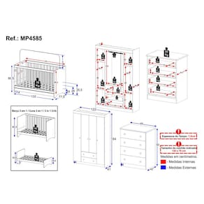Dimensões do Produto Montado: Berço - Altura: 80,5cm | Largura: 133cm | Profundidade: 77,5cm Guarda-roupa - Altura: 184cm | Largura: 122cm | Profundidade: 41cm Cômoda - Altura: 83cm | Largura: 65cm | Profundidade: 42cm *Você pode consultar as medidas detalhadas na imagem técnica do produto.