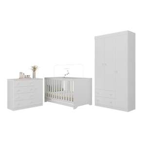 Diferenciais: - 3 anos de garantia contra defeitos de fabricação e material. - Conjunto produzido em madeira de reflorestamento (MDP 12/15mm) com acabamento acetinado (cerca de 20% de brilho): sustentabilidade e durabilidade. - Berço 3 em 1 que se transforma em sofá e minicama, acompanhando o crescimento do bebê. - Lastro em madeira com 3 regulagens de altura e suporte para mosquiteiro para noites mais tranquilas e protegidas. - Berço certificado pelo INMETRO (Selo n 0000085/2018). - Padrão americano (tamanho do colchão indicado: 130x70cm). Colchão não incluso. - Grade Soft (PVC): ecologicamente correta, com matéria-prima livre de metais pesados, atóxica e com proteção antiamarelamento. - Guarda-roupa com 3 portas e 2 gavetas: amplo espaço para organizar roupinhas e acessórios. - Cômoda com 1 porta e 4 gavetas. - Corrediças telescópicas: abertura total e silenciosa das gavetas. - Cabideiro em alumínio: permite acomodar roupas longas e curtas para que não amassem. - Puxadores em ABS delicados e práticos. - Rodapés: visual elegante para o guarda-roupa e a cômoda. - Sistema antitombamento no guarda-roupa e cômoda: proporciona segurança para o bebê e tranquilidade aos pais.