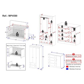 Dimensões do Produto Montado: Berço - Altura: 80,5cm | Largura: 133cm | Profundidade: 77,5cm Guarda-roupa - Altura: 184cm | Largura: 92cm | Profundidade: 41cm Cômoda - Altura: 83cm | Largura: 95cm | Profundidade: 42cm *Você pode consultar as medidas detalhadas na imagem técnica do produto.