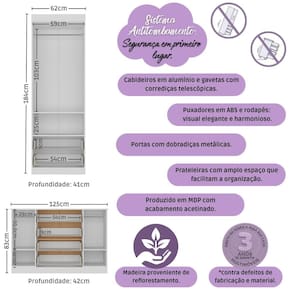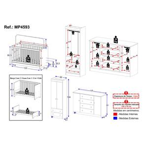 Dimensões do Produto Montado: Berço - Altura: 80,5cm | Largura: 133cm | Profundidade: 77,5cm Guarda-roupa - Altura: 184cm | Largura: 62cm | Profundidade: 41cm Cômoda - Altura: 83cm | Largura: 125cm | Profundidade: 42cm *Você pode consultar as medidas detalhadas na imagem técnica do produto.