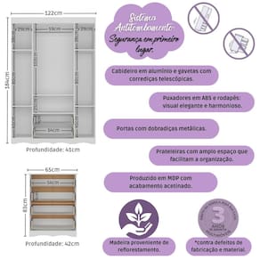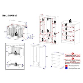 Dimensões do Produto Montado: Berço - Altura: 80,5cm | Largura: 133cm | Profundidade: 77,5cm Guarda-roupa - Altura: 184cm | Largura: 122cm | Profundidade: 41cm Cômoda - Altura: 83cm | Largura: 65cm | Profundidade: 42cm *Você pode consultar as medidas detalhadas na imagem técnica do produto.