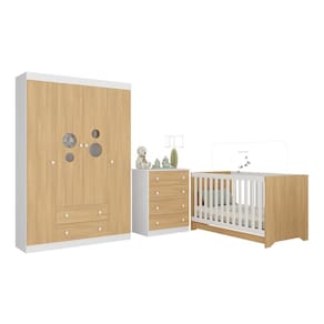 Diferenciais: - 3 anos de garantia contra defeitos de fabricação e material. - Conjunto produzido em madeira de reflorestamento (MDP 12/15mm) com acabamento acetinado (cerca de 20% de brilho): sustentabilidade e durabilidade. - Berço 3 em 1 que se transforma em sofá e minicama, acompanhando o crescimento do bebê. - Lastro em madeira com 3 regulagens de altura e suporte para mosquiteiro para noites mais tranquilas e protegidas. - Berço certificado pelo INMETRO (Selo n 0000085/2018). - Padrão americano (tamanho do colchão indicado: 130x70cm). Colchão não incluso. - Grade Soft (PVC): ecologicamente correta, com matéria-prima livre de metais pesados, atóxica e com proteção antiamarelamento. - Guarda-roupa com 4 portas e 2 gavetas produzidas em MDF: amplo espaço para organizar roupinhas e acessórios. - Cômoda com 4 gavetas. - Detalhes de vidro incolor temperado 3mm nas portas: toque charmoso que permite visualizar o interior dos móveis. - Corrediças telescópicas: abertura total e silenciosa das gavetas. - Cabideiro em alumínio: permite acomodar roupas longas e curtas para que não amassem. - Puxadores em ABS delicados e práticos. - Rodapés: visual elegante para o guarda-roupa e a cômoda. - Sistema antitombamento no guarda-roupa e cômoda: proporciona segurança para o bebê e tranquilidade aos pais.