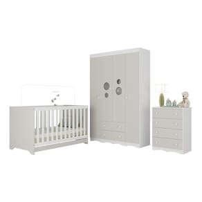Diferenciais: - 3 anos de garantia contra defeitos de fabricação e material. - Conjunto produzido em madeira de reflorestamento (MDP 12/15mm) com acabamento acetinado (cerca de 20% de brilho): sustentabilidade e durabilidade. - Berço 3 em 1 que se transforma em sofá e minicama, acompanhando o crescimento do bebê. - Lastro em madeira com 3 regulagens de altura e suporte para mosquiteiro para noites mais tranquilas e protegidas. - Berço certificado pelo INMETRO (Selo n 0000085/2018). - Padrão americano (tamanho do colchão indicado: 130x70cm). Colchão não incluso. - Grade Soft (PVC): ecologicamente correta, com matéria-prima livre de metais pesados, atóxica e com proteção antiamarelamento. - Guarda-roupa com 4 portas e 2 gavetas produzidas em MDF: amplo espaço para organizar roupinhas e acessórios. - Cômoda com 4 gavetas. - Detalhes de vidro incolor temperado 3mm nas portas: toque charmoso que permite visualizar o interior dos móveis. - Corrediças telescópicas: abertura total e silenciosa das gavetas. - Cabideiro em alumínio: permite acomodar roupas longas e curtas para que não amassem. - Puxadores em ABS delicados e práticos. - Rodapés usinados em MDF: visual elegante para o guarda-roupa e a cômoda. - Sistema antitombamento no guarda-roupa e cômoda: proporciona segurança para o bebê e tranquilidade aos pais.