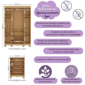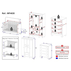 Dimensões do Produto Montado: Berço - Altura: 80,5cm | Largura: 133cm | Profundidade: 77,5cm Guarda-roupa - Altura: 189cm | Largura: 122cm | Profundidade: 41cm Cômoda - Altura: 88cm | Largura: 65cm | Profundidade: 42cm *Você pode consultar as medidas detalhadas na imagem técnica do produto.