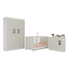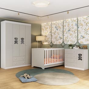Diferenciais: - 3 anos de garantia contra defeitos de fabricação e material. - Conjunto produzido em madeira de reflorestamento (MDP 12/15mm) com acabamento acetinado (cerca de 20% de brilho): sustentabilidade e durabilidade. - Berço 3 em 1 que se transforma em sofá e minicama, acompanhando o crescimento do bebê. - Lastro em madeira com 3 regulagens de altura e suporte para mosquiteiro para noites mais tranquilas e protegidas. - Grade Soft (PVC): ecologicamente correta, com matéria-prima livre de metais pesados, atóxica e com proteção antiamarelamento. - Berço certificado pelo INMETRO (Selo n 0000085/2018). - Padrão americano (tamanho do colchão indicado: 130x70cm). Colchão não incluso. - Guarda-roupa com 4 portas e 2 gavetas: amplo espaço para organizar roupinhas e acessórios. - Cômoda com 1 porta e 4 gavetas. - Portas e gavetas produzidas em MDF. - Detalhes de vidro incolor temperado 3mm nas portas: toque charmoso que permite visualizar o interior dos móveis. - Corrediças telescópicas: abertura total e silenciosa das gavetas. - Cabideiro em alumínio: permite acomodar roupas longas e curtas para que não amassem. - Puxadores em ABS delicados e práticos. - Rodapés: visual elegante para o guarda-roupa e a cômoda. - Sistema antitombamento no guarda-roupa e cômoda: proporciona segurança para o bebê e tranquilidade aos pais.