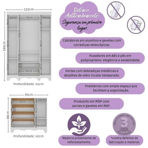 Diferenciais: - 3 anos de garantia contra defeitos de fabricação e material. - Conjunto produzido em madeira de reflorestamento (MDP 12/15mm) com acabamento acetinado (cerca de 20% de brilho): sustentabilidade e durabilidade. - Berço 3 em 1 que se transforma em sofá e minicama, acompanhando o crescimento do bebê. - Lastro em madeira com 3 regulagens de altura e suporte para mosquiteiro para noites mais tranquilas e protegidas. - Berço certificado pelo INMETRO (Selo n 0000085/2018). - Padrão americano (tamanho do colchão indicado: 130x70cm). Colchão não incluso. - Grade Soft (PVC): ecologicamente correta, com matéria-prima livre de metais pesados, atóxica e com proteção antiamarelamento. - Guarda-roupa com 4 portas e 2 gavetas: amplo espaço para organizar roupinhas e acessórios. - Cômoda com 1 porta e 4 gavetas. - Portas e gavetas produzidas em MDF. - Detalhes de vidro incolor temperado 3mm nas portas: toque charmoso que permite visualizar o interior dos móveis. - Corrediças telescópicas: abertura total e silenciosa das gavetas. - Cabideiro em alumínio: permite acomodar roupas longas e curtas para que não amassem. - Puxadores em ABS delicados e práticos. - Pés em polipropileno e rodapés usinados em MDF: visual elegante e estabilidade para o guarda-roupa e a cômoda. - Sistema antitombamento no guarda-roupa e cômoda: proporciona segurança para o bebê e tranquilidade aos pais.