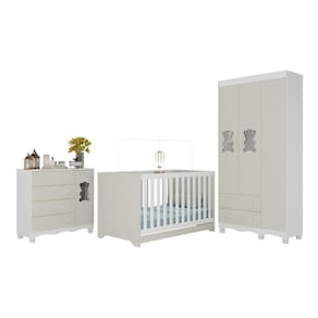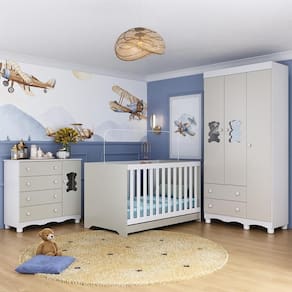 Diferenciais: - 3 anos de garantia contra defeitos de fabricação e material. - Conjunto produzido em madeira de reflorestamento (MDP 12/15mm) com acabamento acetinado (cerca de 20% de brilho): sustentabilidade e durabilidade. - Berço 3 em 1 que se transforma em sofá e minicama, acompanhando o crescimento do bebê. - Lastro em madeira com 3 regulagens de altura e suporte para mosquiteiro para noites mais tranquilas e protegidas. - Berço certificado pelo INMETRO (Selo n 0000085/2018). - Padrão americano (tamanho do colchão indicado: 130x70cm). Colchão não incluso. - Grade Soft (PVC): ecologicamente correta, com matéria-prima livre de metais pesados, atóxica e com proteção antiamarelamento. - Guarda-roupa com 3 portas e 2 gavetas: amplo espaço para organizar roupinhas e acessórios. - Cômoda com 1 porta e 4 gavetas. - Portas e gavetas produzidas em MDF. - Detalhes de vidro incolor temperado 3mm nas portas: toque charmoso que permite visualizar o interior dos móveis. - Corrediças telescópicas: abertura total e silenciosa das gavetas. - Cabideiro em alumínio: permite acomodar roupas longas e curtas para que não amassem. - Puxadores em ABS delicados e práticos. - Pés em polipropileno e rodapés usinados em MDF: visual elegante e estabilidade para o guarda-roupa e a cômoda. - Sistema antitombamento no guarda-roupa e cômoda: proporciona segurança para o bebê e tranquilidade aos pais.