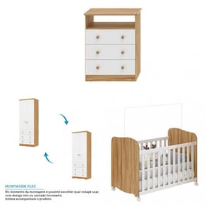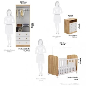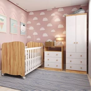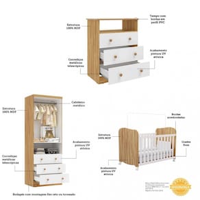 O Berço Uli Peroba segue o padrão de colchão americano e é fabricado em MDF com pintura atóxica. O estrado, ajustável em altura, é feito de MDF e madeira maciça, com grades e cabeceiras de diferentes espessuras de MDF para maior segurança. As bordas arredondadas proporcionam segurança adicional, e o berço inclui suporte para cortinado. Possui certificação do Inmetro: 001950/2019. O Guarda Roupa Smim é feito em MDF com acabamento em pintura UV atóxica, portas com dobradiças metálicas e gavetas com corrediças metálicas telescópicas que garantem um deslize suave e silencioso. Os puxadores são de plástico e o produto acompanha dois modelos de rodapés, sendo ideal para espaços reduzidos. A Cômoda 3 Gavetas Smim com Nicho Peroba é uma peça elegante e funcional, feita 100 em MDF, com três gavetas amplas e um nicho para armazenamento extra. O tampo robusto e bordas revestidas com perfis de PVC aumentam a durabilidade e refinamento. As gavetas possuem puxadores plásticos e corrediças metálicas de alta qualidade.