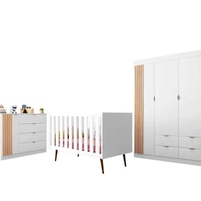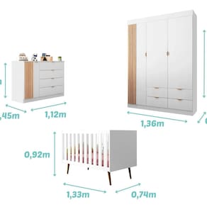 Com um design encantador, esses móveis são esteticamente agradáveis e extremamente funcionais. O Guarda Roupa possui 4 gavetas e 3 portas, já a Cômoda Infantil tem 4 gavetas e uma porta com prateleira interna. Os puxadores de alumínio na cor cobre adicionam um toque especial, com estrutura em 100% MDF, acabamento em pintura UV, corrediças telescópicas e dobradiças metálicas garante a durabilidade e realça a beleza. O guarda-roupa oferece um cabideiro de alumínio, quatro prateleiras e um maleiro, permitindo uma organização eficiente para roupas e acessórios das crianças. Acabamento da Gaveta: Pintura UV Acabamento da Porta: Pintura UV Acompanha Manual de Instalação: Sim Altura do Conjunto: 199 cm Ambiente Principal: Quarto Infantil Certificado: 006 495/2021 Certificado INMETRO (código): 006 495/2021 codigo_ean: 7900288172983 Complexidade da Montagem: Média: pode ser montado por mais de uma pessoa e/ou necessite de maior conhecimento para montagem Cor: Branco Cor do Produto: Branco Cor Interna: Branco Escala de Brilho: Acetinado Escala de Brilho da Gaveta: Fosco Estrado com Regulagem de Altura: Sim Estrado Regulável em Quantas Posições: 03 Largura do Conjunto: 381 cm Linha ou Coleção: Ayla Manual de Especificação Técnica: https://product-hub-prd.madeiramadeira.com.br/625790569/documents/25a34fe1-80d7-4771-9d8f-01d55d2391142950244187517480284933288.pdf Manual de Montagem e Instalação: https://product-hub-prd.madeiramadeira.com.br/625790569/documents/20d88888-cd63-485e-9837-53b5218ce0692996559532217498492278457.pdf Marca: Phoenix Baby Material da Gaveta: MDF Material da Porta: MDF Material da Prateleira: MDF Material do Estrado: HDF Material do Fundo: MDF Material do Puxador da Gaveta: Alumínio Material Principal: MDF Medida de Cada Item: Guarda Roupas: 199x136x45cm // Cômoda: 90x112x45cm // Berço 92x133x74cm modular: Não Necessita Montagem: Sim Origem do Produto: Nacional Peso: Guarda Roupas: 93kgs // Cômoda: 43Kgs // Berço : 36Kgs Peso de Cada Item: Guarda Roupas 93kgs, Comoda 43kgs, Berço 36kgs Porta Janelada: Não Possui Certificado: Sim Possui Espelhos: Não Possui Gavetas: Sim Possui Portas: Sim Possui Prateleiras: Sim Possui Rodízio: Não Profundidade do Conjunto: 74 cm Quantidade de Gavetas: 08 Quantidade de Prateleiras: 06 Recomendações de Uso, Manutenção e Limpeza: Pano Levemente umedecido Sistema de Montagem: Parafusos, cavilha, e Minifix Suporta Até (kg): 15.0000 Tipo de Corrediça da Gaveta: Metálica Telescópica Tipo de Dobradiça/Corrediça da Porta: Metálica Tipo de Puxador da Gaveta: Externo