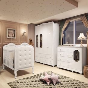 O Quarto de Bebê Completo com Berço Mini Cama com capitonê Guarda Roupa e Cômoda 100 MDF Elô New Noah Móveis Peroba é um ambiente encantador e delicado, transmitindo tranquilidade e conforto para todos. Produtos fabricados com linhas suaves com estrutura em 100 MDF e acabamento em Pintura UV atóxica é o destaque deste ambiente. As gavetas possuem corrediças telescópicas para facilitar o deslize das gavetas e os espaços internos proporcionam armazenamento prático para roupas e itens essenciais em suas prateleiras e nos cabideiros em alumínio. Algumas portas possuem janelas em PETG Cristal/Acrílico permitindo a visualização do seu interior. O berço é um charme com suas bordas curvas, capitonê em corino e rodízios. Além disso, é certificado pelo INMETRO e pode ser utilizado como Mini Cama ou Mini Sofá, acompanhando o crescimento do seu bebê.